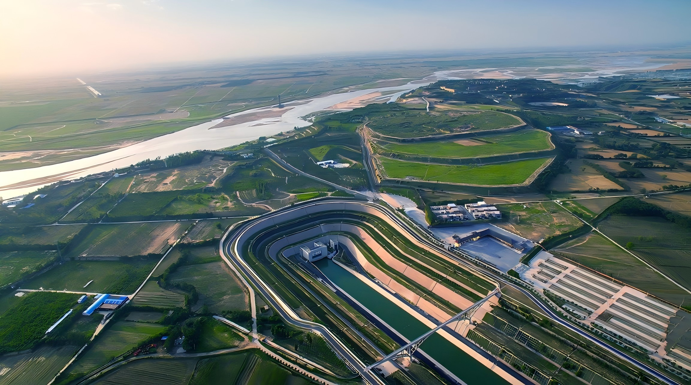 《南水潤國志》作品以穿黃干渠為視覺中軸,雙排盾構機鉆頭定格鑿穿黃河的攻堅瞬間。左側呈現富士康科技園等工業集群,展現工程對現代工業體系的強力支撐;右側是受水城市地標建筑,遠處農田沿渠鋪展,生動詮釋了南水北調工程作為優化水資源配置、保障群眾飲水安全、復蘇河湖生態環境、暢通南北經濟循環的“生命線”重要作用。
